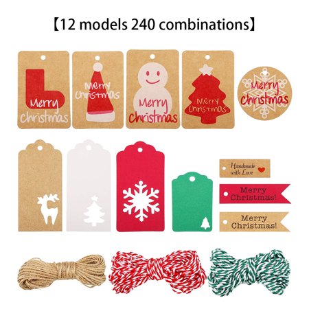 Maoww Christmas Paper Gift Tags Vintage Hang Label with Twine Xmas Card for DIY Arts Crafts, 12 Models 240pcs Combinations