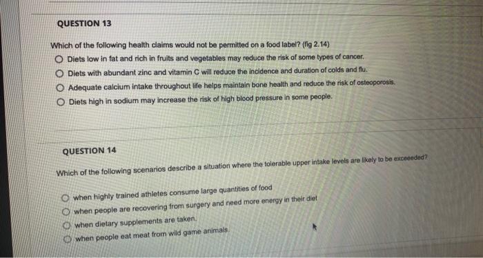 NUTR 120 - Wiley Quiz 6 Flashcards | Quizlet Which claim on a food label is NOT allowed? There is no evidence that Canadians are suffering from serious deficiencies of vitamin A and C, while some segments of the Canadian population may not be getting enough vitamin D or potassium Which health claim on a food label is not allowed? - Quora Health claims in food labeling are claims that have been reviewed by FDA and are allowed on food products to show that a food or food component may reduce the risk of a disease or a health-related condition. "Low Carb" Claims Are NOT Permitted on Food Labels Under ... - Mondaq United States: "Low Carb" Claims Are NOT Permitted on Food Labels Under Current FDA Regulations 14 October 2004 by Michael D. Flanagan and Martin Mann Foley & Lardner Your LinkedIn Connections with the authors With the recent trend of low carbohydrate diets, U.S. food companies have raced to market their products to carb-watchers. Which claim on a food label is not allowed a a - Course Hero The daily value of nutrient Y = 1000mg. What claim could be made for the following food with respect to its content ofnutrient Y? a) It is an excellent source of nutrient Y. b) It is a good source of nutrient Y.c) It is a source of nutrient Y. d) No claim can be made. Answer: d