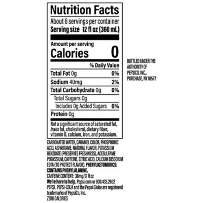 Pepsi Soda Diet Wild Cherry - 2 Liter - Shaw's Pepsi Soda Diet Wild Cherry - 2 Liter. Details; Ingredients; More; Pepsi - the bold, refreshing, robust cola. Live For Now. ... Show More Show Less. Ingredients. Nutrition Facts; Serving Size: 12OZA Servings Per Container: Calories: Amount Per Serving 0 % Daily Value: ... Consult Product label for the most current and accurate information.