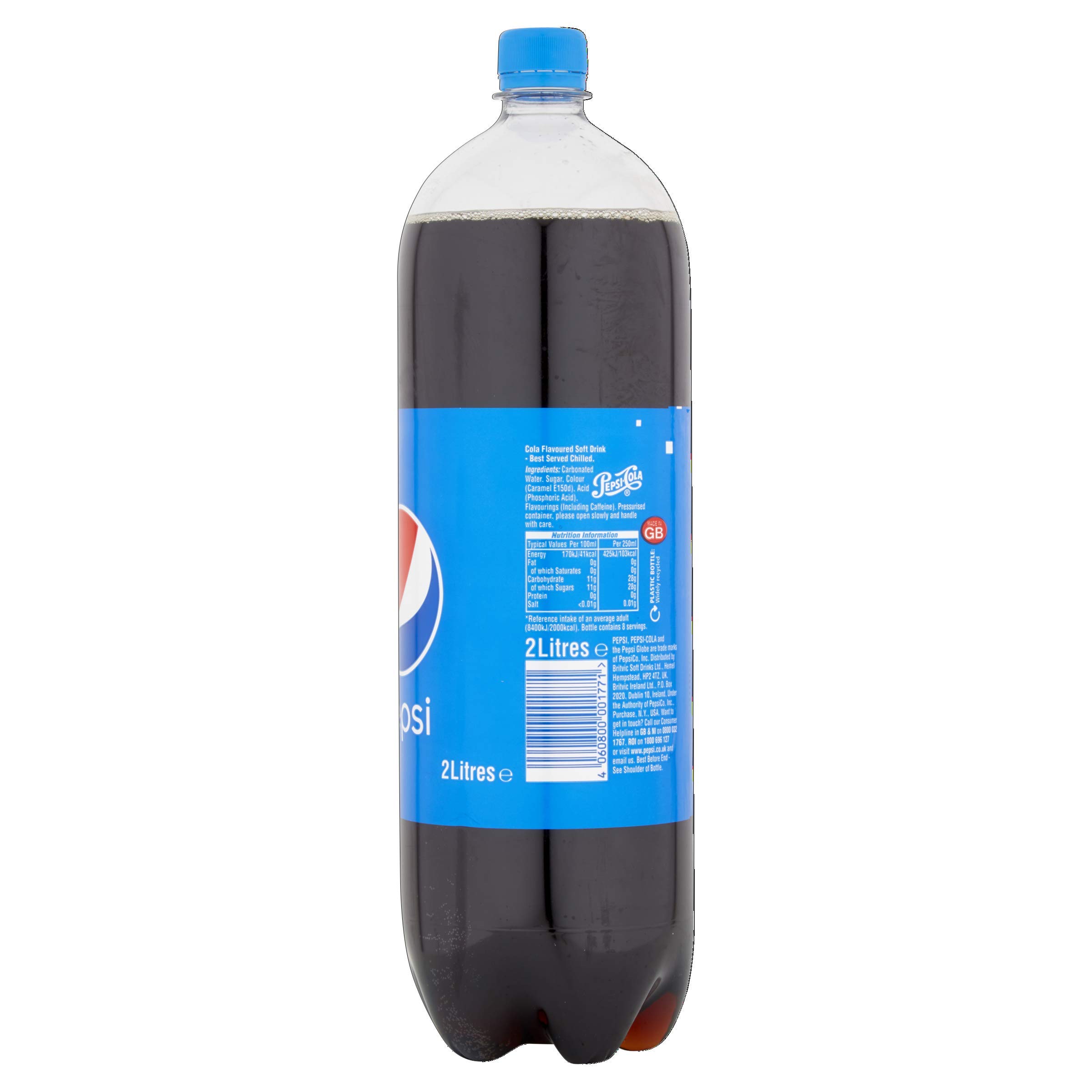 Diet Pepsi Cola 2 Litre Bottle - Tesco Groceries Add Diet Pepsi Cola 2 Litre Bottle Add add Diet Pepsi Cola 2 Litre Bottle to trolley. Any 2 for £3 Clubcard Price - Selected Pepsi Max Or Pepsi Diet 2 Litre Offer valid for delivery from 22/06/2022 until 12/07/2022. Clubcard Price. Per 250ml: Energy 8kJ 2kcal <1% of the reference intake. Fat 0g-0% of the reference intake.