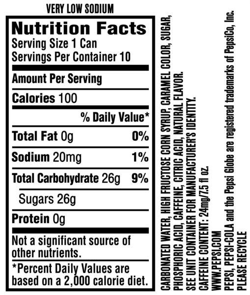 Pepsi nutritional label. Pepsi Soda Diet - 20 Fl. Oz. - Online Groceries | Vons Soda, Diet Classic Diet Pepsi Taste. 0 calories per bottle. Caffeine Content: 59mg/20 fl oz. Pepsi.com. We're here to help. Pepsi.com or 800-433-2652. Cash in (Subject to rules (at) Pepcoin.com. Snack purchase required. Must accrue minimum balance for payment. For promo questions call 800-332-1741) pepcoin.com. Cash out with venmo & paypal. The Thick Blue Line The announcement of the endorsement included PepsiCo brands MTN DEW, Aquafina, Rockstar, Lay's, Tostitos, Ruffles, Doritos, Cheetos, Rold Gold and Miss Vickie's, but no Gatorade. I could only conclude that PepsiCo made some sort of weird decision to cater to hockey fans like me, who prefer to get their exercise reaching into the snack bag ... Consumers and Manufacturers Share Responsibility for the Health of the ... Those carrying environmental claims are growing at three times the pace of total food and beverage activity. Ethical claims regarding the environment increased their share of total food and beverage launches from 4.4% in 2016-2017 to 6.6% in 2020-2021, for a 17.3% CAGR over the five years ending Q3 2021. Growth is even faster for specific issues. PepsiCo's New ESG Summary Offers First Look at Progress Toward Industry ... In addition, 53% of PepsiCo's beverage portfolio volume now has less than 100 Calories from added sugars per 12oz. serving 5 and 66% of its convenient foods portfolio volume does not exceed 1.3 milligrams of sodium per Calorie 6.