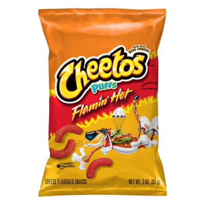 Cheetos Puffs Flamin Hot Flavor * 8 Oz. Bag * Made w/real cheese BB 07/ ... (1) bag of Cheetos Puffs Flamin Hot Flavor 8 Oz. Bag Made with real cheese. Best by date is 07/12/2022.