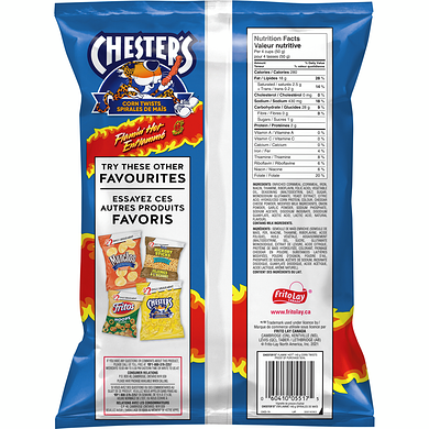 CHESTER'S® FLAMIN' HOT® Flavored Puffcorn Snacks | FritoLay CHESTER'S ® FLAMIN' HOT ® Flavored Puffcorn Snacks When CHESTER CHEETAH puts his name on a snack, you can count on a bold and cheesy flavor like you've never tasted. CHESTER'S ® snacks are made with a special blend of real cheese seasoning to give each bite the perfect pop and zing.