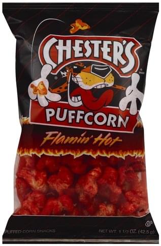 Chester's Puffcorn Flamin' Hot Puffed Corn Snacks 4.5 oz, pack of 1 Chester's Puffcorn Butter Puffed Corn Snacks, 3.5 Oz (1 bag) $8.49 ($2.43/Ounce) Chester's Puffcorn Snacks, Cheese, 4.5 Ounce $7.70 ($1.71/Ounce) Customers also search fire cheetos puffs cheetos gifts puffin corn hot flaming puffcorn chester puffcorn cheese red hot popcorn hot spicy popcorn hot cheetos merchandise Product details