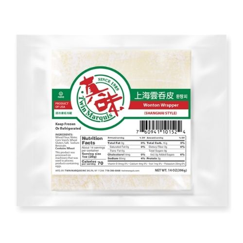 Nutrition Facts and Calories in Wonton wrappers (includes egg roll ... Nutrition Summary. Positive Facts: This serving of Wonton wrappers (includes egg roll wrappers) is a good source of Manganese, Selenium, Thiamin and Riboflavin . Negative Facts: This serving of Wonton wrappers (includes egg roll wrappers) has high Sodium . Please note the percent daily values are based on a 2,000 calorie diet. Wonton Wrappers Recipe | Allrecipes An original recipe for wonton wrappers — handmade from ... 14 calories; protein 0.4g; carbohydrates 2.7g; fat 0.1g; cholesterol 2.6mg; sodium ... and placed a wonton wrapper in between each moistened towel square. THOM79 . Rating: 5 stars. 01/21/2009. Wow! I thought this would be hard to make but the wrappers came out excellent. Mollie Hopson ... How Many Calories in Wonton wrappers (includes egg roll wrappers) This option will ensure that the nutrition facts shown are 100% accurate for your specific amount of Wonton wrappers (includes egg roll wrappers). Edit your serving size prev next 1 oz (28.35g) Nutrition Facts Serving Size: 1 x 1 oz (28.35g) Calories 82.529 Total Fat 0.425 g Saturated Fat 0.075 g Trans Fat 0 Monounsaturated Fat 0.055 g {EASY!} Homemade Wonton Wrappers - I Am Homesteader Apr 21, 2020 · I just think the round shape makes it a little easier to wrap up the tasty fillings that are held in each wrapper. Use them for my Jalapeno Popper Wontons and Cream Cheese Wontons. Homemade Wonton Wrappers Dough. To make homemade wonton wrappers, start by mixing the flour and salt on a clean work surface. Create a well and add the egg.