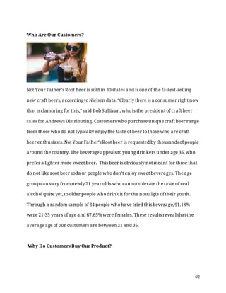 How Many Calories Are In Not Your Fathers Root Beer Not Your Fathers Root Beer has just 177 calories per 12-ounce drink and an alcohol content (ABV) of 5.0%. Compared to other root beers, it contains a small amount of sugar (about 40 grams per 12-ounce drink). Not Your Fathers Root Beer is a gluten-free drink that's high in carbohydrates, with about 5 grams per 12-ounce serving.