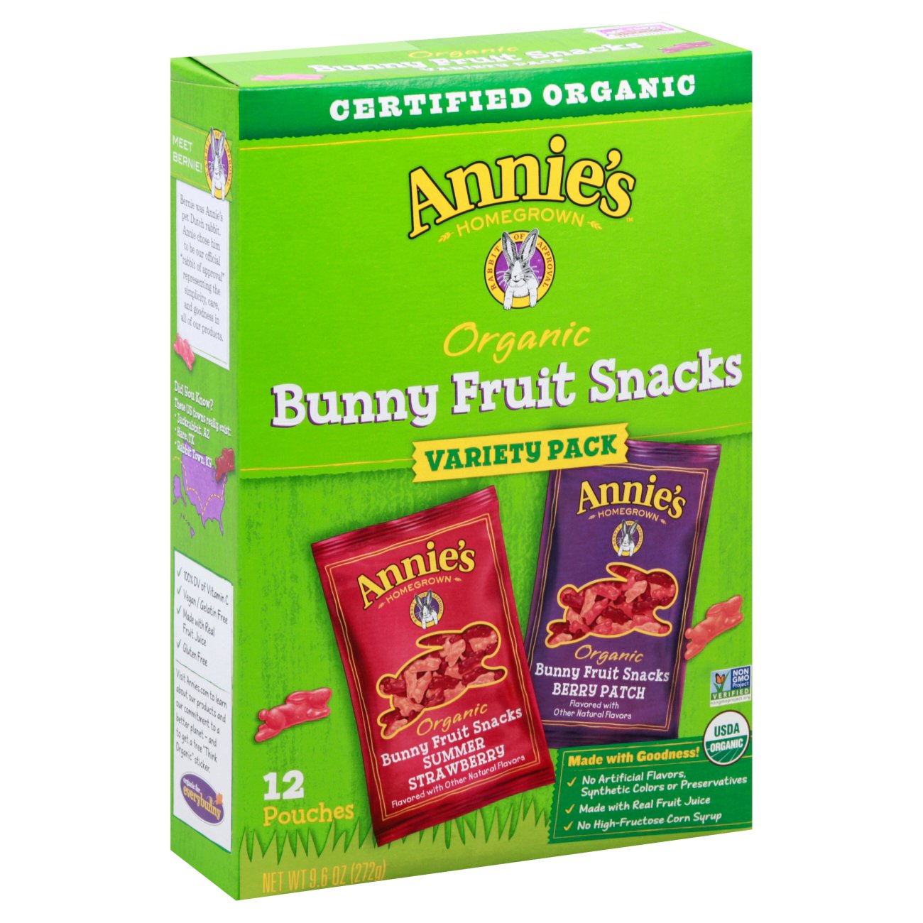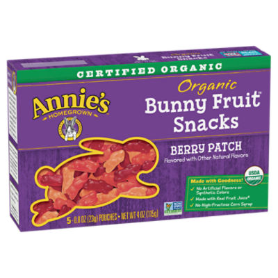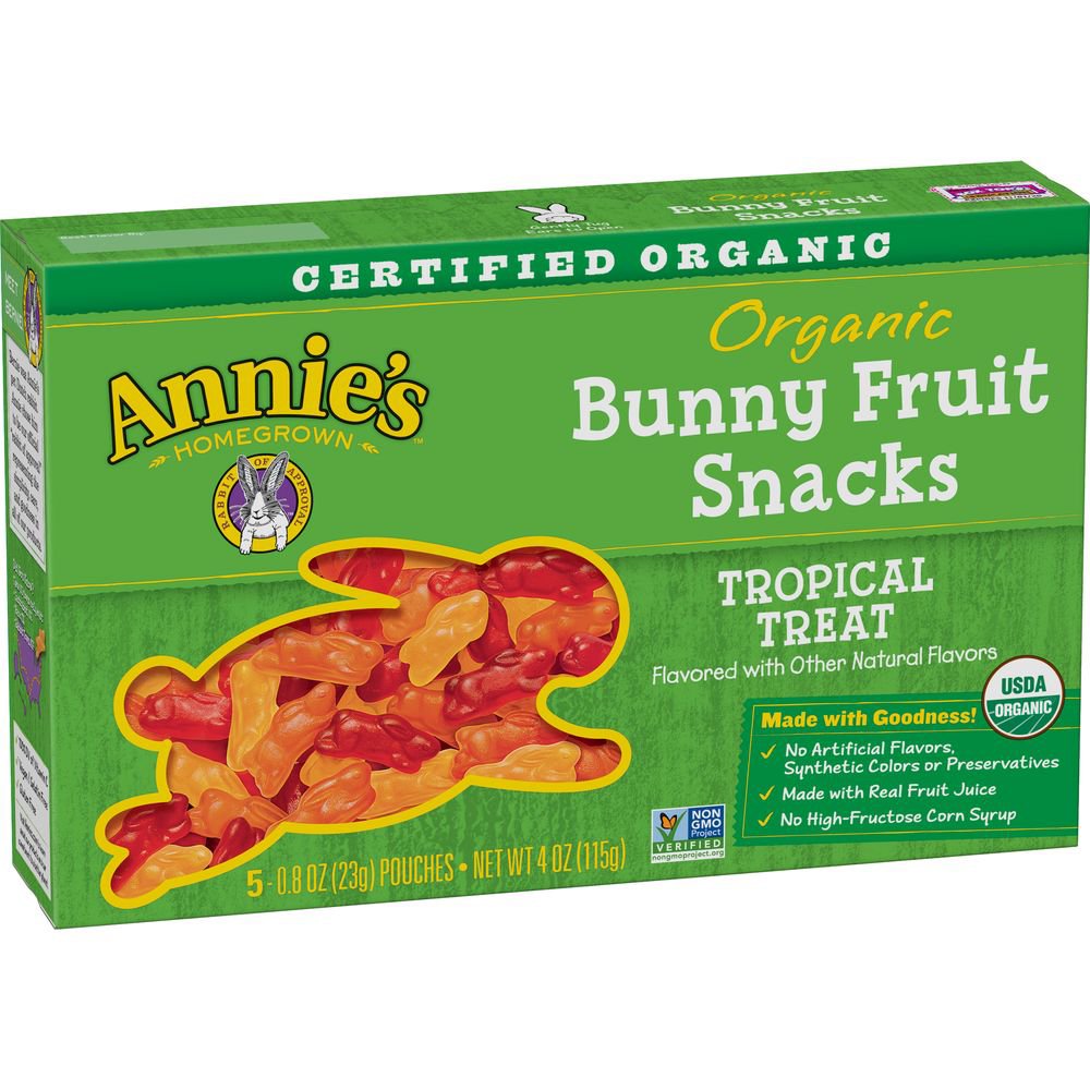 Annie's Organic Bees Bugs & Butterflies Fruit Kid Snacks, 4 oz Nutrition Facts. Best Ingredients: Organic Tapioca Syrup, Organic Cane Sugar, Organic Tapioca Syrup Solids, Water, Organic Pear Juice Concentrate, Organic Honey, Pectin, Citric Acid, Sodium Citrate, Organic Natural Flavor, Organic Sunflower Oil, Organic Color (Organic Black Carrot, Organic Black Currant Extracts), Organic Carnauba Wax. Dairy-Free. Annie's Homegrown Organic Bunny Berry Patch Fruit Snacks - 5ct organic tapioca syrup, organic cane sugar, organic tapioca syrup solids, organic pear juice concentrate, water, pectin, citric acid, sodium citrate, organic natural flavor, ascorbic acid (vitamin c), organic sunflower oil, organic color (organic black carrot, organic black currant extracts), organic carnauba wax Shipping details Buy Annie's Homegrown Products at Whole Foods Market Annie's Homegrown Organic Classic Mild Cheddar Macaroni & Cheese (Grass Fed) Add to list Annie's Homegrown Organic Summer Strawberry Fruit Snacks Add to list Annie's Homegrown Double Chocolate Chip Chewy Gluten Free Granola Bars Add to list Annie's Homegrown Organic Cinnamon Grahams Add to list Annie's Homegrown Organic Cinnamon Grahams Add to list