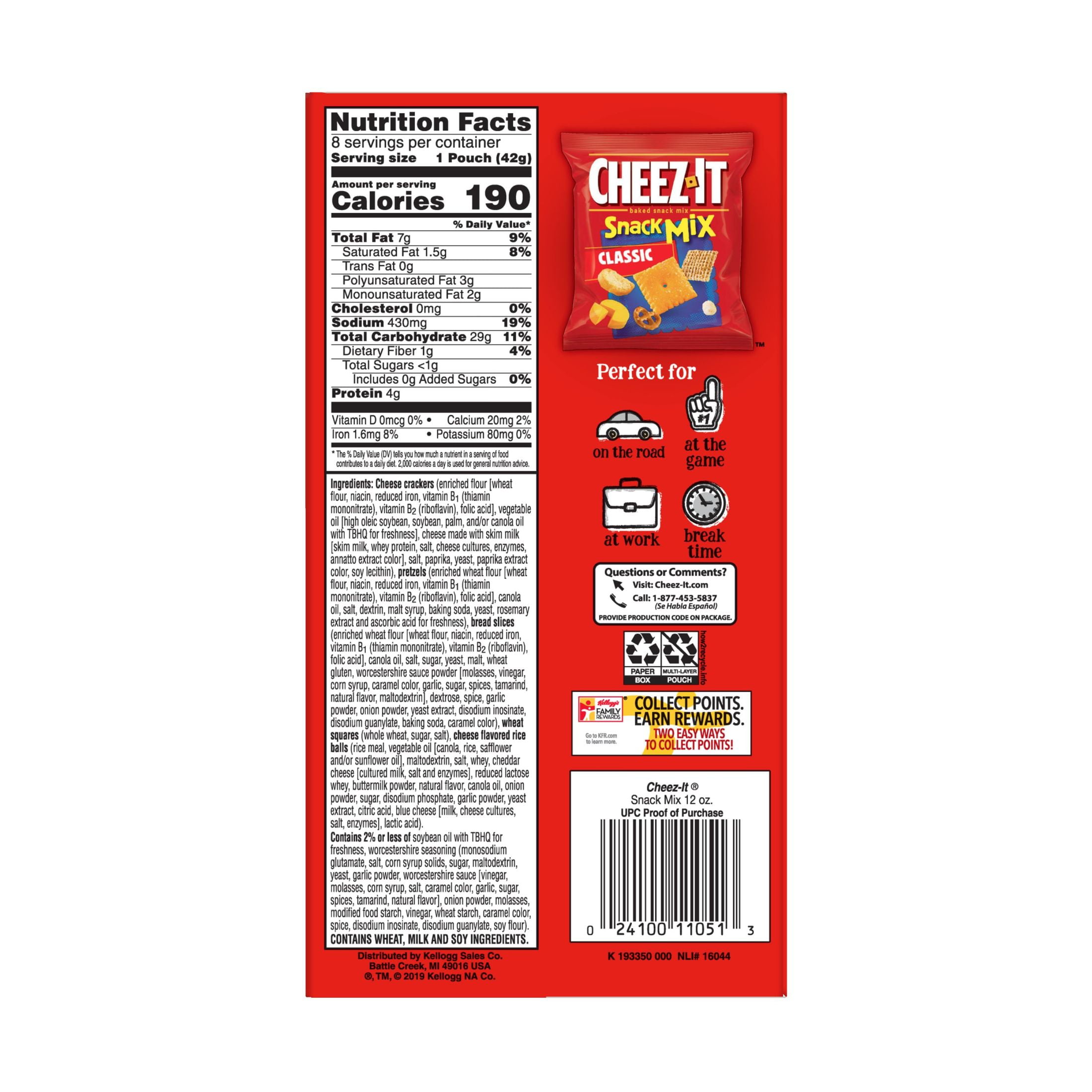 Cheez it nutrition facts. grocerynutrition.org › cheez-itCheez-it Nutrition Facts - GroceryNutrition.org Cheez-it Nutrition Facts Select a Cheez-it product below to view the full nutrition facts, Weight Watchers points and ingredients. Our database currently contains 29 items from Cheez-it. Baby Swiss Baked Snack Crackers Bacon & Cheddar Flavored Baked Snack Crackers Baked Snack Crackers Buffalo Wing Flavored Baked Snack Crackers › Crackers,_cheese_(Cheez-It)_54304005_nutritional_valueCrackers, cheese (Cheez-It) nutrition facts and analysis. Crackers, cheese (Cheez-It) contains 2.6 g of saturated fat and 1.5 mg of cholesterol per serving. ... Cheez-It® Original Snack Crackers - SmartLabel™ - Kellogg's Cheez-It® Original Snack Crackers Nutrition Ingredients Allergens Features & Benefits & Sustainability 210 Calories 2.5 g Sat Fat 320 mg Sodium 0 g Sugar Nutrition Facts Servings Per Container 8 Serving Size 1 Pouch (42 g) Cheez-It® Snack Mix Double Cheese - SmartLabel™ Cheez-It® Snack Mix Cheez-It® Snack Mix Double Cheese. 9.75 oz. 00024100493845. Nutrition . Ingredients . Allergens . Features & Benefits . Company, Brand & Sustainability . 130. Calories. 1 g. Sat Fat. 380 mg. Sodium <1 g. Sugar. Nutrition Facts. Servings Per Container About 10. Serving Size 1/2 Cup (28 g) Amount Per Serving; Calories 130 ...