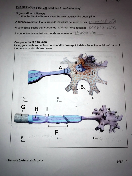 PDF Nervous System Worksheet 1. The diagram below is of a nerve cell or neuron. Add the following labels to the diagram: Axon Myelin sheath Cell body Dendrites Muscle fibers Axon terminals 2. Color in the diagram as suggested below. Axon - purple Axon Terminals - orange Myelin sheath - yellow Cell body - blue Dendrites - green Muscle fibers - red 3. Overview of neuron structure and function - Khan Academy The axons of peripheral neurons that travel a common route are bundled together to form nerves. Classes of neurons Based on their roles, the neurons found in the human nervous system can be divided into three classes: sensory neurons, motor neurons, and interneurons. Sensory neurons
