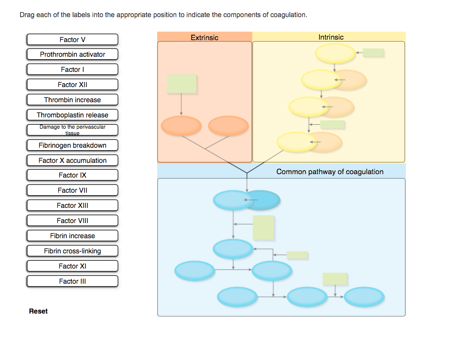 Chapter 18 Blood Anatomy Flashcards | Quizlet Drag each of the labels into the appropriate position to indicate the components of coagulation. Extrinsic Pathway = damage to the perivascular tissue, thromboplastin release Intrinsic pathway = Factor XII, Factor IX Common PAthway= Factor X accumulation, prothrombin activator, fibrinogen breakdown, thrombin increase?, Fibrin increase? Solved Drag each of the labels into the appropriate position - Chegg Question: Drag each of the labels into the appropriate position to indicate the components of coagulation Intrinsic Factor V Prothrombin activator Factor lI Factor XII Thrombin increase Thromboplastin release ExtrinSIC amage oervasCu Fibrinogen breakdown Factor X accumulation Factor IX Factor ViI Factor XIIl Factor VIIl Fibrin increase Fibrin …